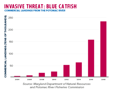 A non-native fish, blue catfish were first introduced to tributaries of the Chesapeake Bay in the 1960s and 1970s and have become popular with recreational fishermen. Their rapid expansion raised concerns about impacts on native species; this prompted the Chesapeake Bay Program to adopt a management strategy in 2012. The strategy recognizes the recreational value of the fish and possible ecosystem impacts if left unmanaged. Unfortunately, population data in the Potomac only goes back to 2013, making it difficult to determine the full extent of the catfish problem in the river and assess whether management strategies are working as intended. Commercial harvesting is considered a key management strategy for blue catfish in the Chesapeake Bay and tidal Potomac River. Limited catfish surveys in the upper (non-tidal) Potomac suggest the population is increasing.