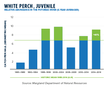 Another abundant and popular recreational fishing species, the white perch population in the Potomac River continues to thrive. In 2018, white perch abundance was up almost 200 percent over the historic mean, a nice rebound from 2016 and 2017 where abundance was below the historic mean. This is consistent with recent historical patterns of a very strong year following several years of weaker numbers. The five-year average survey results exceed the historic mean by 141 percent.