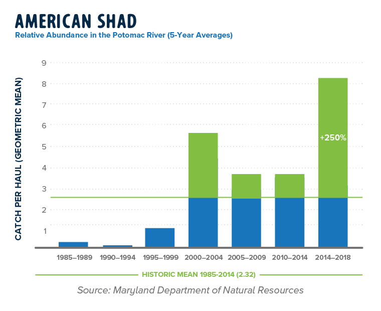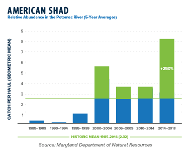 A strict commercial harvest ban, initiated in the 1980s in both Maryland and Virginia began a long-term recovery effort. Where shad continue to struggle in the James River and other Chesapeake Bay tributaries, they are thriving in the Potomac. Since 2011, the species continuously exceeds restoration targets. The average abundance of shad between 2014 and 2018 exceeded the historic mean by 350 percent.