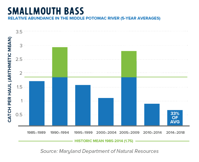 Maryland’s state fish, the striped bass, experienced a difficult year throughout the region. Concerns about overfishing along the Atlantic coast led the Virginia Marine Resources Commission to close the 2019 striped bass fishing season in Virginia. Additional harvesting restrictions could soon be enacted by the Atlantic States Marine Fisheries Commission. Because resource decisions are based on regional population trends, healthy populations can be seen locally while unhealthy populations could be found in other areas along the Atlantic coast. Average striped bass abundance in the Potomac River between 2014-2018 measures 78 percent of the historic mean.