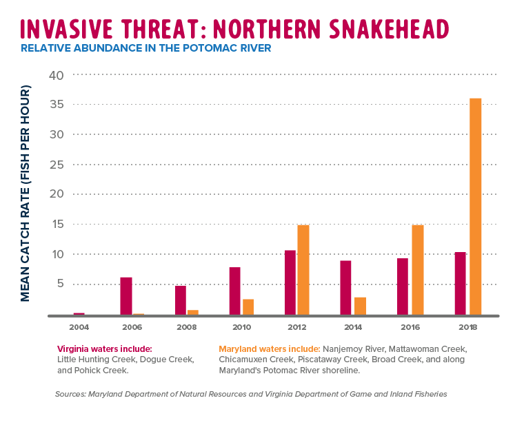 Since 2002, the population of northern snakehead increased rapidly and expanded to multiple tributaries in Maryland and Virginia, even upstream of Great Falls which was considered a natural barrier. Scientists have reported variable population trends suggesting the invasive threat continues to exist and should continue to be closely monitored. Some studies indicate the population may be stabilizing despite the continual expansion of their territory, but one recent study suggests they are negatively impacting native fish species.