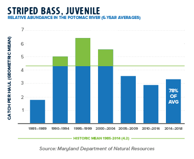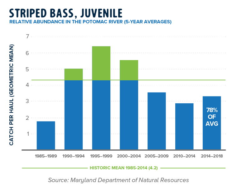 Restoration goals do not currently exist for most species in this report and grades were determined by comparing the most recent 5-year average young-of-year survey mean to a 30-year historic average. Data are provided by the Chesapeake Bay Program, Maryland Department of Natural Resources (DNR), Virginia Department of Game and Inland Fisheries (DGIF), and the Potomac River Fisheries Commission (PRFC).